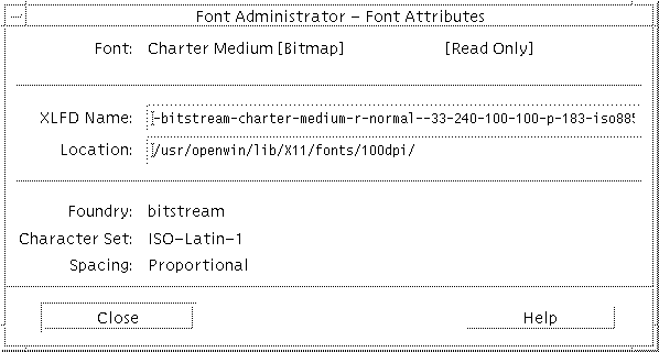Note - The Font Attributes dialog stays up until you click Close, displaying attributes in turn for each font you select. To view attributes for additional fonts, simply click the fonts one at a time in the list on the main window.