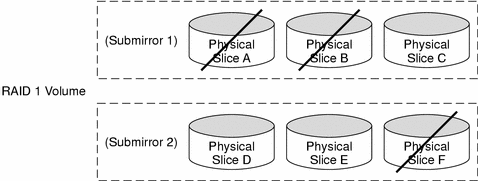 Mirror d1 consists of two submirrors, each of which consists of three identical physical disks and the same interlace value. A failure of three disks, A, B, and F can be tolerated because the entire logical block range of the mirror is still contained on at least one good disk.