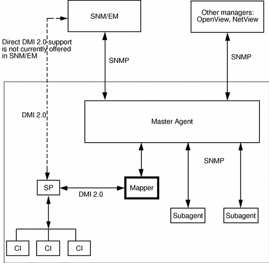 The communication path between an SNMP management application and the DMI consists of the SNMP Master Agent and the DMI mapper snmpXdmid, as described in the following sections.
