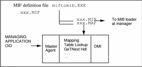 The mapping of MIF to MIB involves the assignment of an OID from the MIF. A translator (miftomib.EXE) is available to build a file extension of .MAP and a .MIB file from a MIF definition. The translator may be used as a tool to generate the .MIB and the .MAP files. Or, the map file may be generated manually, using a text editor. All .MAP files located in the directory under /var/dmi/map are scanned and included in the subagent translation table.