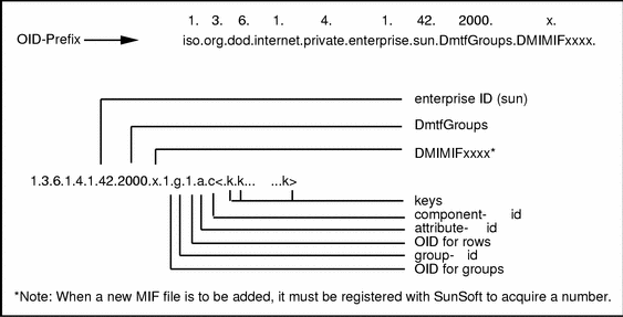 See Figure 6-3 for examples of the OID prefix and the completed OID layout. The mapping file is used by the mapper to register the OID with the SNMP agent relay and to correlate the OID with the component name. It contains the component ID and the group keys, in case the group contains tabular data.
