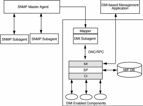 Sun provides DMI based functionality for management of the Sun platforms (hardware and software) and software applications running on these platforms. The DMI subagent is one type of subagent included in the SEA product. By using DMI, you may manage various elements within most systems (for example, PCs, workstations, routers, hubs, and other network objects).