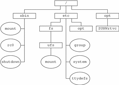 For example, the following figure shows a local file system, starting with a root (/) file system and the sbin, etc, and opt subdirectories.