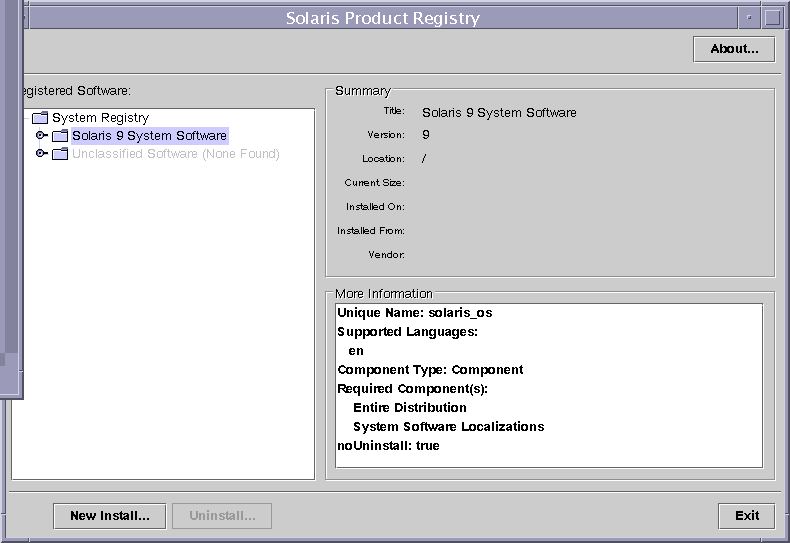 For software products that were installed with the Solaris Web Start program, the Product Registry contains values for at least the following: Title, Version, Location, and Installed on. Items in an expanded list under a product or software group inherit the version information of the product.