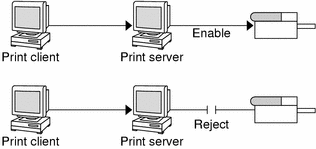 The enable and disable commands control whether a printer prints or stops printing requests that are in the print queue. When you disable a printer, the printer stops printing requests in queue. However, requests are still added to the queue. (You must set the printer to reject print requests so requests are not added to the queue. For information about rejecting print requests, see "Accepting or Rejecting Print Requests".)