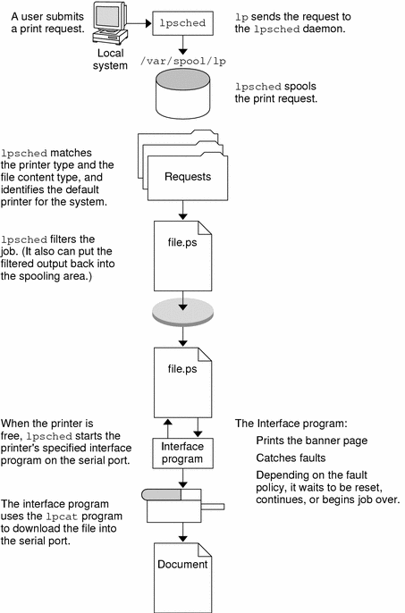The following figure shows what happens when a user submits a request to print a PostScript file on a local printer, which is a printer connected to the user's system. The local system does all processing. However, the print request follows the same path it would if the client and server were separate systems. Requests always flow from client to server following the same path.