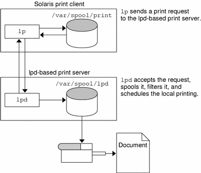 The following figure shows what happens when a user on a Solaris print client submits a print request to a lpd-based print server. The command opens a connection and handles it's own communications with the print server directly.