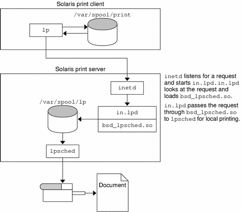 The following figure shows what happens when a user on a Solaris print client submits a print request to a Solaris print server. The print command on the print client handles the local part of each print request by communicating directly with the print server.