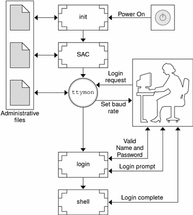 As shown in the following figure, the init process is the first process to be started at boot time. Consulting its administrative file (/etc/inittab), the init process starts other processes as they are needed. Listed among those processes is the SAC.