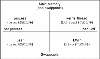 A process can consist of multiple LWPs and multiple application threads. The kernel schedules a kernel-thread structure, which is the scheduling entity in the SunOS environment. Various process structures are described in the following table.