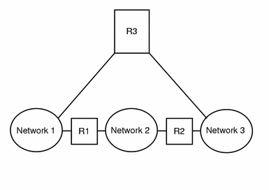 The following figure shows a more complex case. Router R3 directly connects networks 1 and 3. The redundancy improves reliability. If network 2 goes down, router R3 still provides a route between networks 1 and 3. You can interconnect many networks. However, the networks must use the same network protocols.