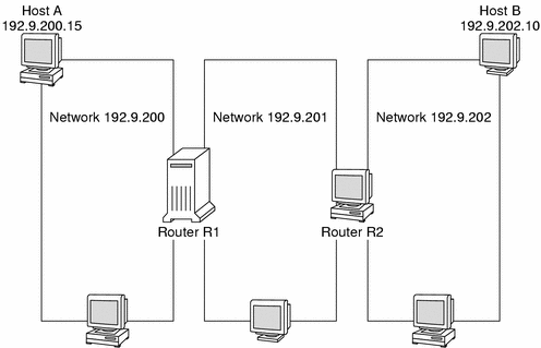 Router R1 connects networks 192.9.200 and 192.9.201. Router R2 connects networks 192.9.201 and 192.9.202. If host A on network 192.9.200 sends a message to host B on network 192.9.202, the following events occur: