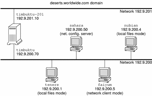 Finally, the machine timbuktu is configured as a router. The machine includes two network interfaces. The first interface is named timbuktu. This interface belongs to network 192.9.200. The second interface is named timbuktu-201. This interface belongs to network 192.9.201. Both networks are in the organizational domain deserts.worldwide.com. The domain uses local files as its name service.