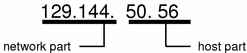 The bytes of the IPv4 address are further classified into two parts: the network part and the host part. The following figure shows the component parts of a typical IPv4 address, 129.144.50.56.