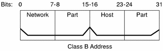 A class B network number uses 16 bits for the network number and 16 bits for host numbers. The first byte of a class B network number is in the range 128-191. In the number 129.144.50.56, the first two bytes, 129.144, are assigned by the InterNIC, and compose the network address. The last two bytes, 50.56, compose the host address, and are assigned at the discretion of the owner of the network number. The following figure graphically illustrates a class B address.