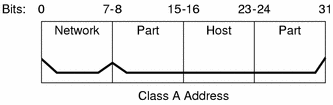 A class A network number uses the first 8 bits of the IPv4 address as its "network part." The remaining 24 bits compose the host part of the IPv4 address, as the following figure illustrates.