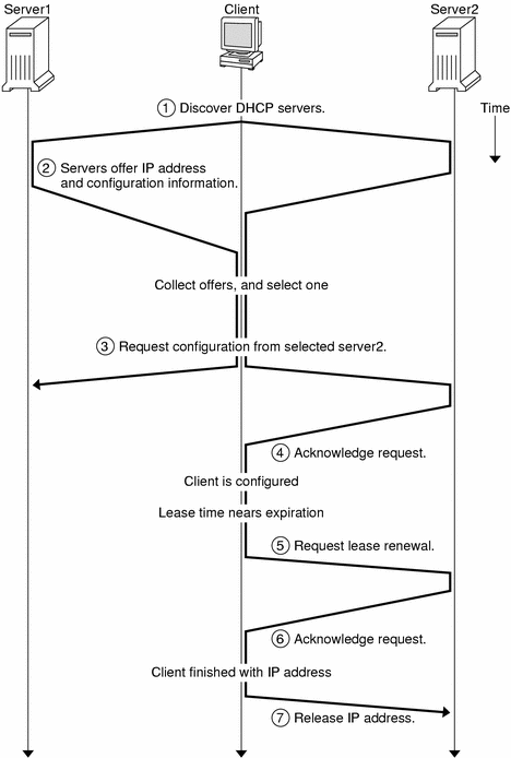 The sequence of events for DHCP service is shown in the following diagram. The numbers in circles correlate to the numbered items in the description following the diagram.