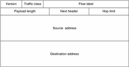 The following figure shows the elements that appear in the IPv6 header and the order in which the elements appear.