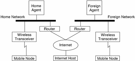 In the instance of wireless communications, the illustrations depict the use of wireless transceivers to transmit the datagrams to the mobile node. Also, all datagrams between the Internet host and the mobile node use the home address of the mobile node. The home address is used even when the mobile node is located on the foreign network. The care-of address is used only for communication with mobility agents. The care-of address is invisible to the Internet host.