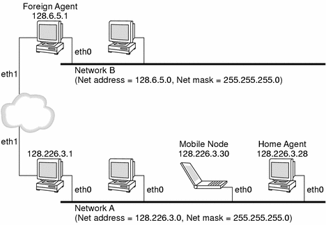 The following illustration shows a mobile node that resides on its home network, Network A, before the mobile node moves to a foreign network, Network B. Both networks support Mobile IP. The mobile node is always associated with the home address of the mobile node, 128.226.3.30.