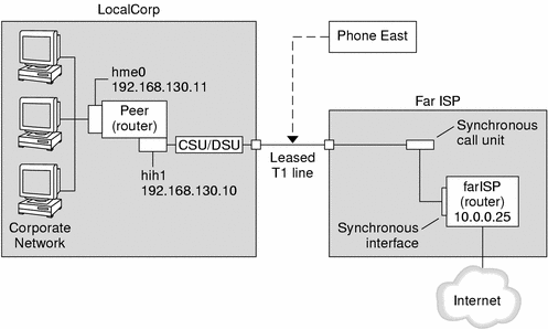 LocalCorp requires speedy transactions and access to the many resources on the Internet. The organization signs a contract with Far ISP, a service provider, that allows LocalCorp to set up its own leased line to Far ISP. Then, LocalCorp leases a T1 line from Phone East, a telephone company. Phone East puts in the leased line between LocalCorp and Far ISP and provides to Local Corp a CSU/DSU that is already configured.