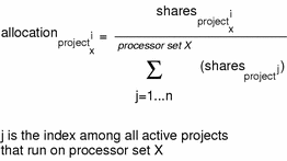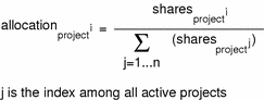 The following formula shows how the FSS scheduler calculates per-project allocation of CPU resources.