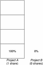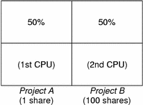 If A and B have only one CPU-bound process each, and SA = 1 and SB = 100, then the total number of shares is 101. Each project cannot use more than one CPU because each project has only one running process. Because no competition exists between projects for CPU resources in this configuration, projects A and B are each allocated 50 percent of all CPU resources. In this configuration, CPU share values are irrelevant. The projects' allocations would be the same (50/50), even if both projects were assigned zero shares.