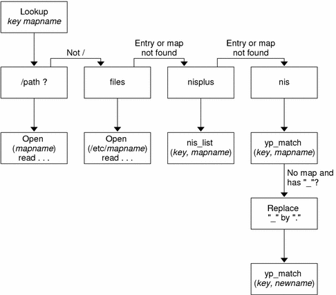 Autofs uses the name service that is specified in the automount entry of the /etc/nsswitch.conf file. If NIS+ is specified, as opposed to local files or NIS, all map names are used as is. If NIS is selected and autofs cannot find a map that it needs, but finds a map name that contains one or more underscores, the underscores are changed to dots. This change allows the old NIS file names to work. Then autofs checks the map again, as shown in Figure 16-4.