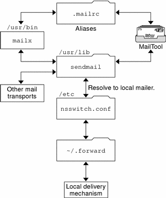 Figure 26-3 shows how sendmail uses aliases. Programs that read mail, such as /usr/bin/mailx, can have aliases of their own, which are expanded before the message reaches sendmail. The aliases for sendmail can originate from a number of name service sources (local files, NIS or NIS+). The order of the lookup is determined by the nsswitch.conf file. Refer to the nsswitch.conf(4) man page.