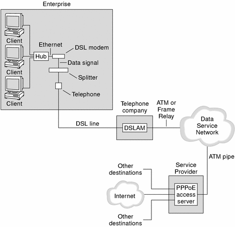 Many network providers and individuals who are working at home use Digital Subscriber Line (DSL) technology to provide fast network access. To support DSL users, Solaris PPP 4.0 includes the PPP over Ethernet (PPPoE) feature. PPPoE technology enables multiple hosts to run PPP sessions over one Ethernet link to one or more destinations.