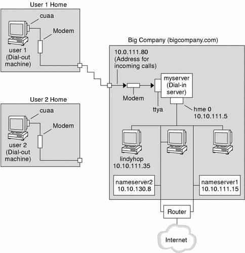 The tasks to be introduced in Chapter 31, Setting Up a Dial-up PPP Link (Tasks) execute a small company's requirement to let employees work at home a few days a week. Some employees require the Solaris operating environment on their home machines. They also need to log in remotely to their work machines on the corporate intranet.