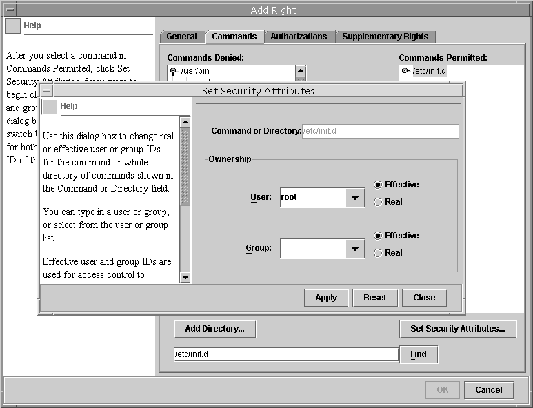 Opens a dialog box for assigning or removing a command's security attributes, that is, real or effective UIDs or GIDs (see Figure 18-6).