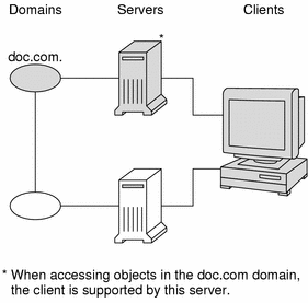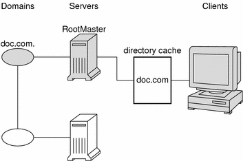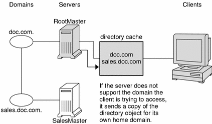 By storing a copy of the namespace's directory objects in its directory cache, a client can know which servers support which domains. (To view the contents of a client's cache, use the nisshowcache command, described in "The nisshowcache Command".) Here is a simplified example: