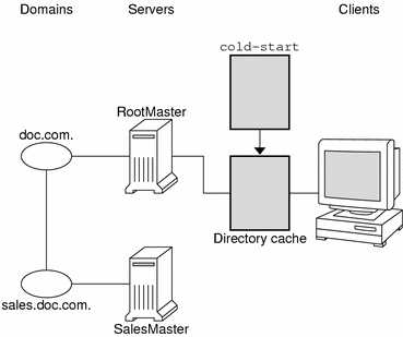 A cold-start file is used only to initialize a client's directory cache. The directory cache, managed by an NIS+ facility called the cache manager, stores the directory objects that enable a client to send its requests to the proper servers.