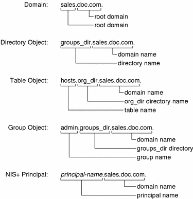 The fully qualified names for all the objects in this namespace, including NIS+ principals, are summarized below.