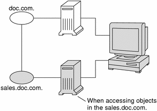 If the request is for access to another domain (for example, sales.doc.com.), the server tries to help the client locate the proper server. If the server has an entry for that domain in its own directory cache, it sends a copy of the domain's directory object to the client. The client loads that information into its directory cache for future reference and sends its request to that server.