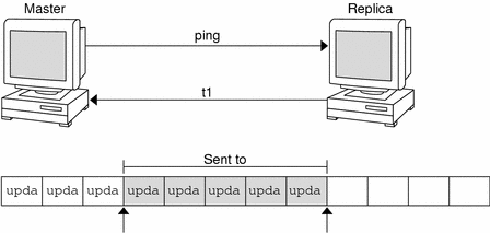 After recording the change in the transaction log, the master sends a message to its replicas, telling them that it has updates to send them. Each replica replies with the time stamp of the last update it received from the master. The master then sends each replica the updates it has recorded in the log since the replica's time stamp: