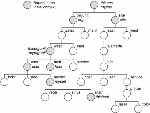 The figure below shows the same naming system as the one shown in Figure 25-2, except that the initial context bindings are shaded and shown in italics. These initial contexts are shown from the point of view of the user, host, or application asking for a name to be resolved.