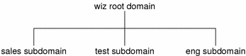 NIS+ is designed to support networks with 100 to 10,000 clients supported by 10 to 100 specialized servers located in sites throughout the world, connected to several "untrusted" public networks. The size and complexity of these networks requires new, autonomous administration practices. The NIS+ domain structure was designed to address these requirements. It consists of hierarchical domains similar to those of DNS, as shown in the following diagram: