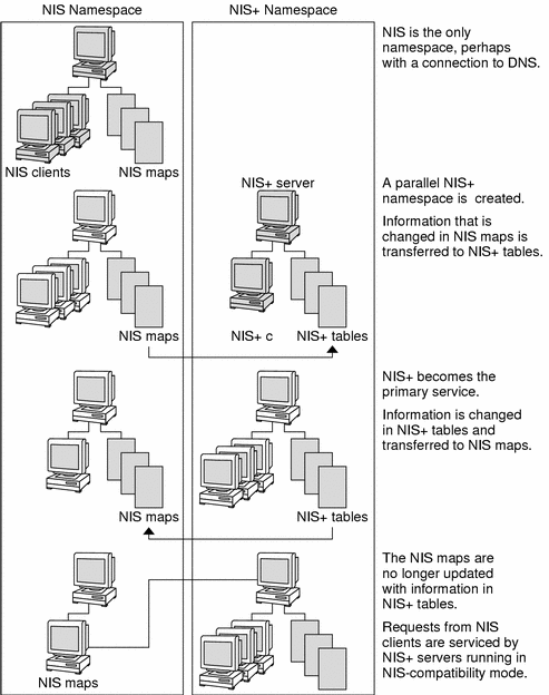Figure 26-11 illustrates how you convert from an NIS-only namespace to an NIS-compatible namespace that responds to both NIS and NIS+ requests.