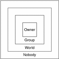 For instance, an object could grant read access to the nobody and world classes; both read and modify access to the group class; and read, modify, create, and destroy access to the owner class.