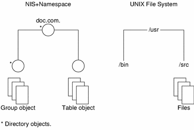 Although both use directories, the other objects in an NIS+ namespace are tables and groups, not files.