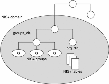An NIS+ domain consists of a directory object, its org_dir directory, its groups_dir directory, and a set of NIS+ tables.