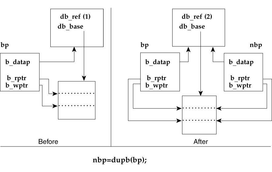 dupb() can fail either due to lack of resources or because the message block has already been duplicated 255 times. In order to handle the latter case, the example calls copyb(9F) (line 22). If copyb(9F) fails, it is due to buffer allocation failure. In this case, qbufcall(9F) is used to initiate a callback (lines 30-31) if one is not already pending (lines 26-27).
