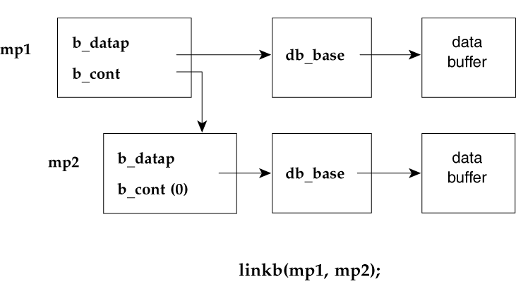 linkb() creates a new message by adding mp2 to the tail of mp1. The continuation pointer, b_cont, of mp1 is set to point to mp2.