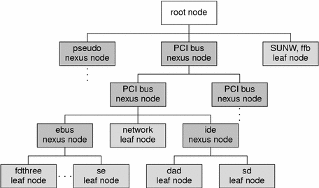 The tree structure creates a parent-child relationship between nodes. This parent-child relationship is the key to architectural independence. When a leaf or bus nexus driver requires a service that is architecturally dependent in nature, it requests its parent to provide the service. This approach enables drivers to function regardless of the architecture of the machine or the processor. A typical device tree is shown in the following figure.