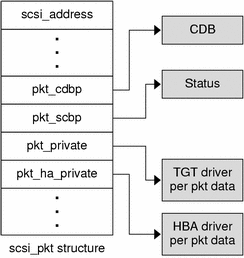 The scsi_pkt(9S) structure members, as well as pkt itself, must be initialized to zero except for the following members: pkt_scbp (status completion), pkt_cdbp (CDB), pkt_ha_private (HBA driver private data), pkt_private (target driver private data). These members are pointers to memory space where the values of the fields are stored, as illustrated in Figure 15-5. For more information, refer to "scsi_pkt Structure".
