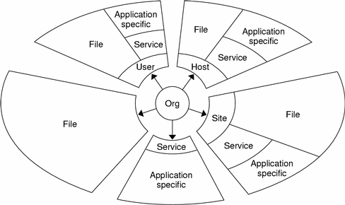 _orgunit | Organizational unit | Site, user, host, file system, service | Enterprise root | Hierarchical | NIS+ domain name Dot-separated, right-to-left |