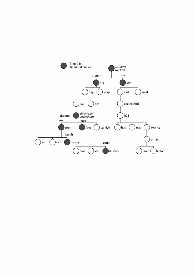 In Table 1-2, the user to which the bindings are related is denoted by U, and the host to which the bindings are related is denoted by H. Not all of these names need to appear in all initial contexts. For example, when a program is invoked by the superuser, none of the user-related bindings appears in the initial context.