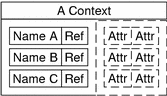 An XFN context is an object that exports the XFN base context programming interface. A context contains a list of atomic names bound to references, as shown in Figure 1-5. An atomic name can have zero or more attributes. Contexts are at the heart of the lookup and binding operations, described extensively in Chapter 2, Interfaces for Writing XFN Applications.